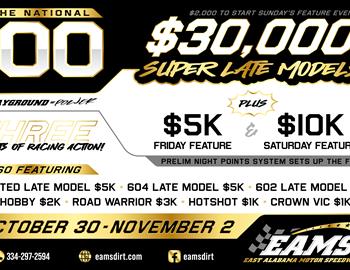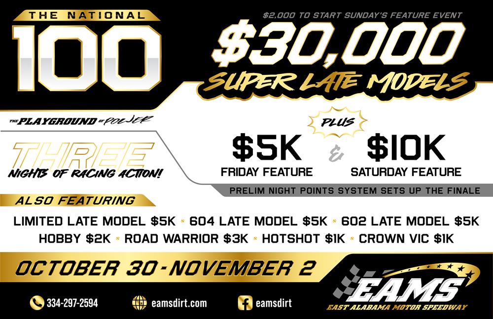 The lineups and payouts have been set for the 2025 running of The National 100 at EAMS! Featuring THREE FULL NIGHTS of Super Late Model racing action